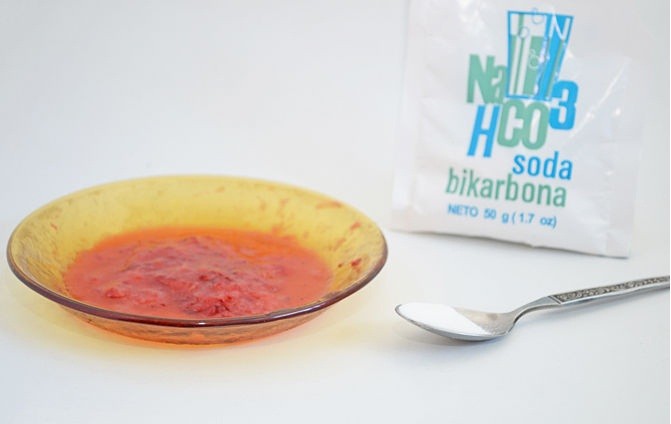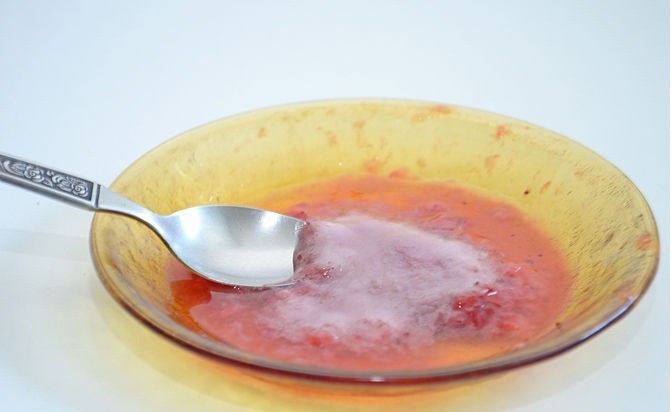 جهزي الفراولة اللازمة و هرسها بالشوكة , ضفي 1/2 معلقة من صودا الخبز إلي الفراولة المهروسة و الخلط جيداً , الخلط جيداً معاً .